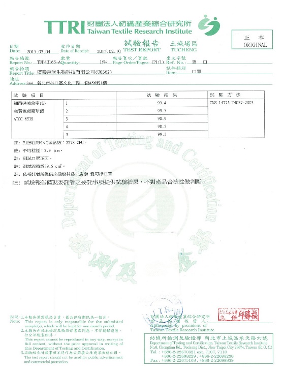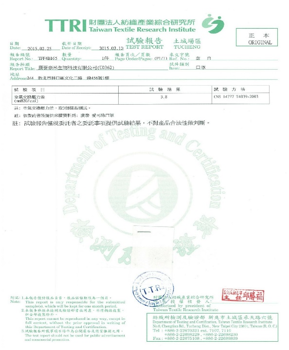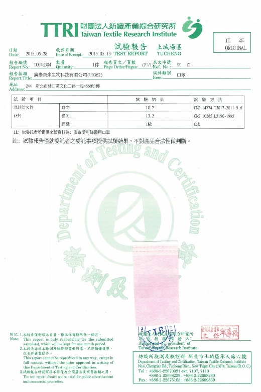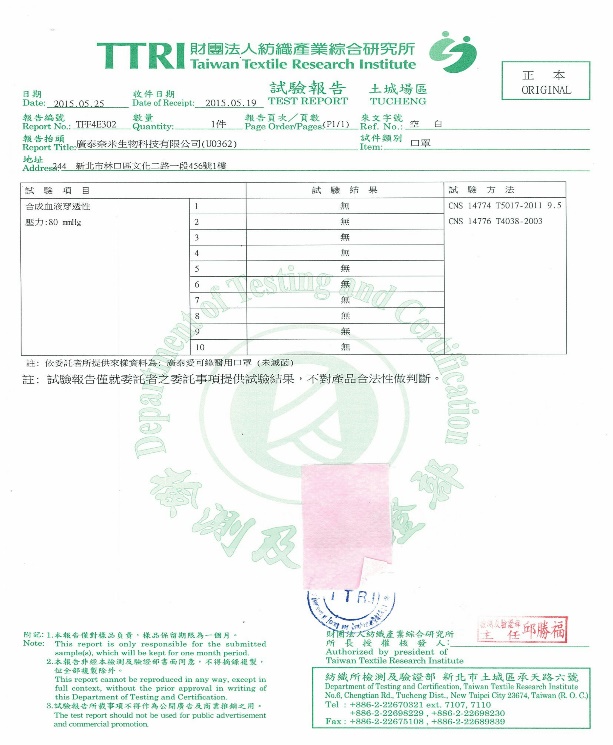 - TTRI財團法人紡織產業綜合研究所:愛可綠口罩測試:無血液穿透性、金黃色葡萄球菌滅菌率>98.5%、固體氣容物過濾效率99.53%(0.075μm)、空氣交換壓力差3.8、可燃性評定一級、呼吸阻抗(吸氣阻力/121.32、呼氣阻力/116.13)