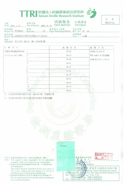 ≥90% | ≥85% | ≥75% | ≥65% | 99.53 % (0.075μm) TTRI_口罩固體氣溶物過濾率 | ||