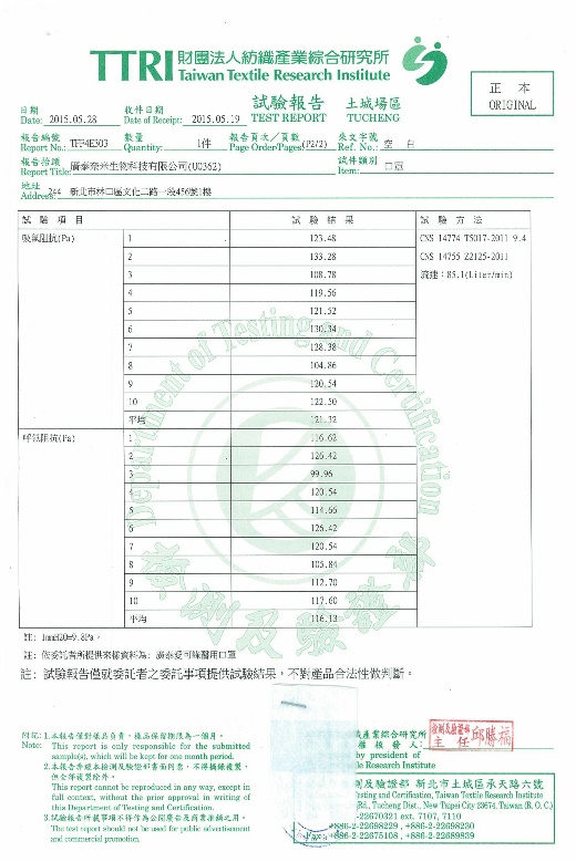 呼吸阻抗 | 吸氣阻力/Pa | ≤175 | ≤150 | 121.32 TTRI_口罩防護效率及呼吸阻抗 | ||
